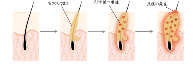 ターンオーバーの乱れや角質肥厚により皮脂がたまってしまうと毛穴がつまり、皮脂をエサとするアクネ菌が増殖します。すると、アクネ菌によって赤みや乾燥、炎症といった症状がでてしまいます。