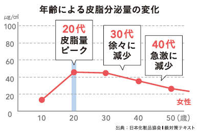 ピークである20代を過ぎると皮脂量は減少し続け、年齢が上がれば上げるほど、保湿が必要に。