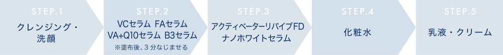 3~5分後、セラムが浸透したのを確認し、アクティベーターリバイブFDまたはナノホワイトセラムを塗布します。