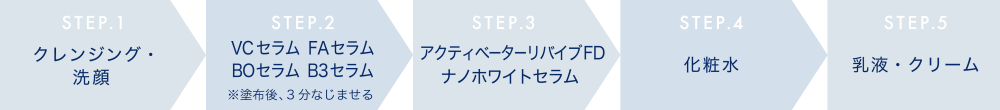 3~5分後、セラムが浸透したのを確認し、アクティベーターリバイブFDまたはナノホワイトセラムを塗布します。